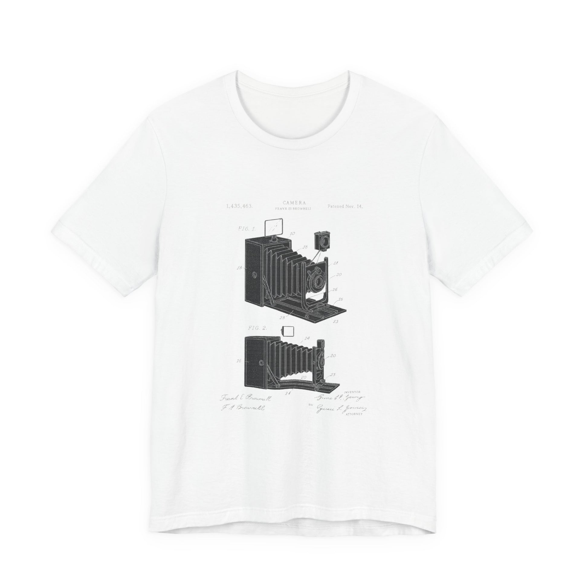 A vintage graphic T-shirt featuring a page from the original patent of the photo camera, with label references and the names of the inventor and attorney. Perfect for history enthusiasts, photographers, and casual wear. Ideal for gifting on birthdays, Christmas, Engineer's Day, and other special occasions.