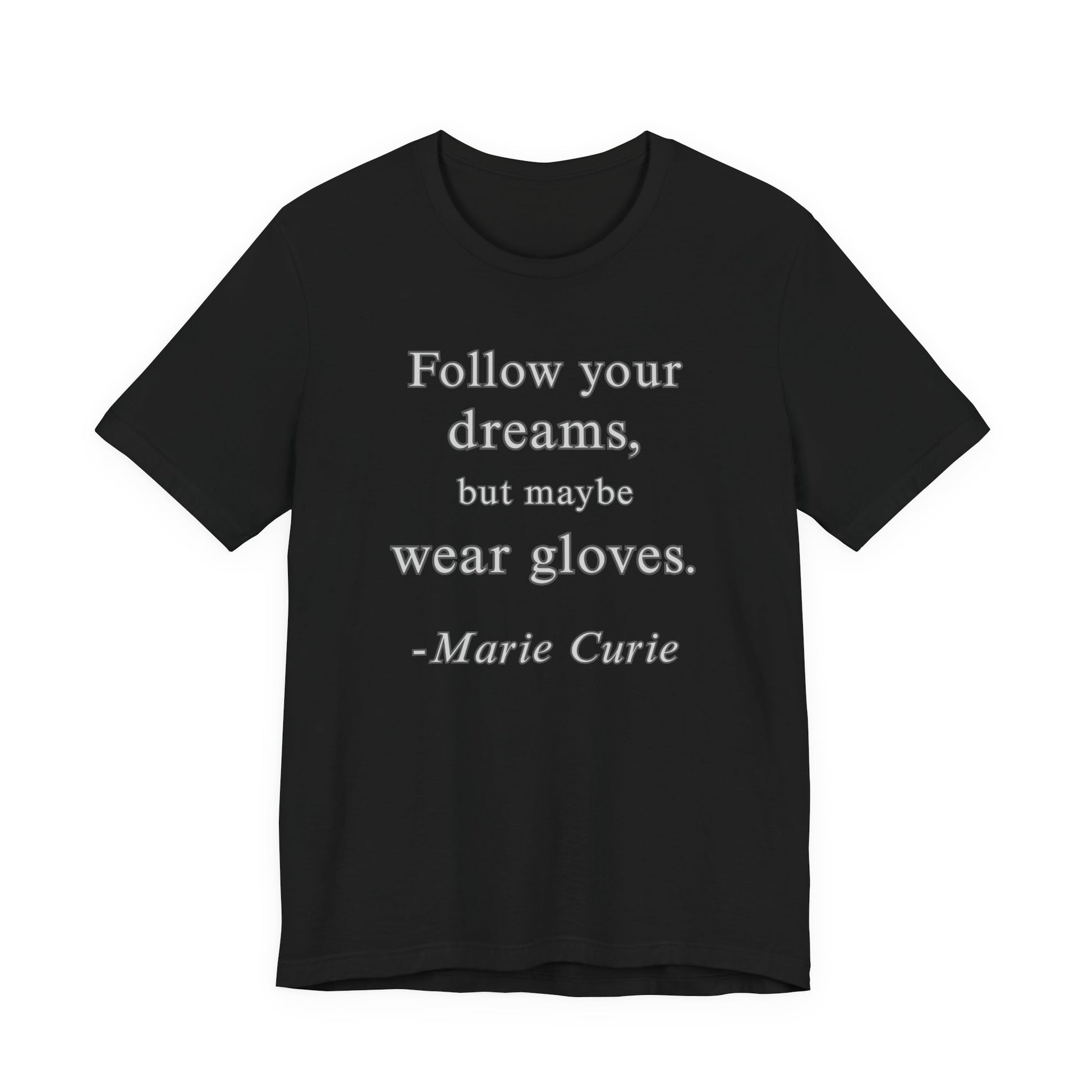 Follow your dreams, but maybe wear gloves - Marie Curie Quote T‑Shirt | Funny and Sarcastic | Roly Poly Print