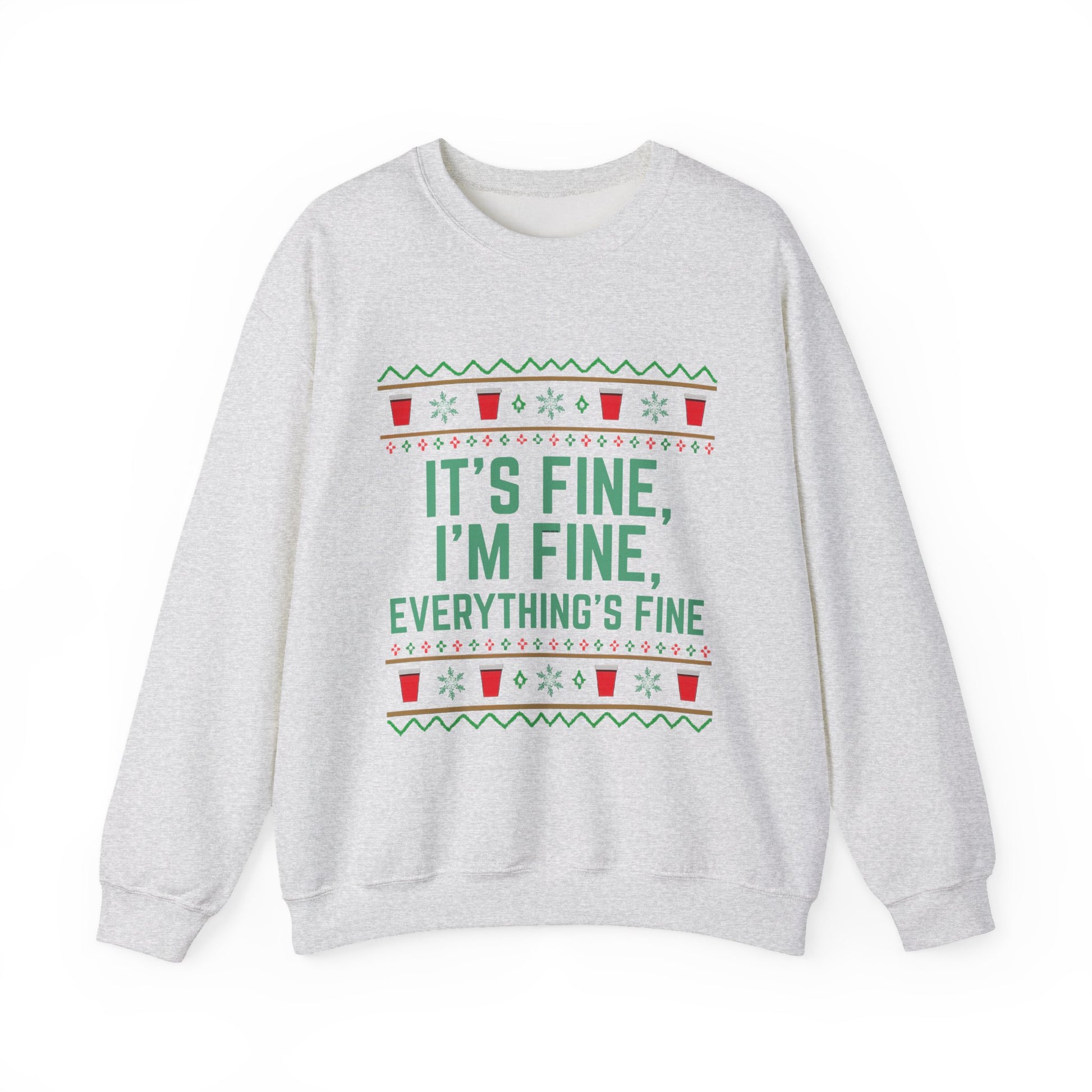 This Funny Holiday Sweatshirt with the quote 'It's Fine, I'm Fine, Everything's Fine' is perfect for those who enjoy a touch of humor during the festive season. It's ideal for anyone looking for a cozy and comfortable Christmas sweater to wear during holiday gatherings or celebrations. This unisex heavy blend crewneck sweatshirt offers a classic fit with top-tier durability, making it a must-have addition to your winter wardrobe.