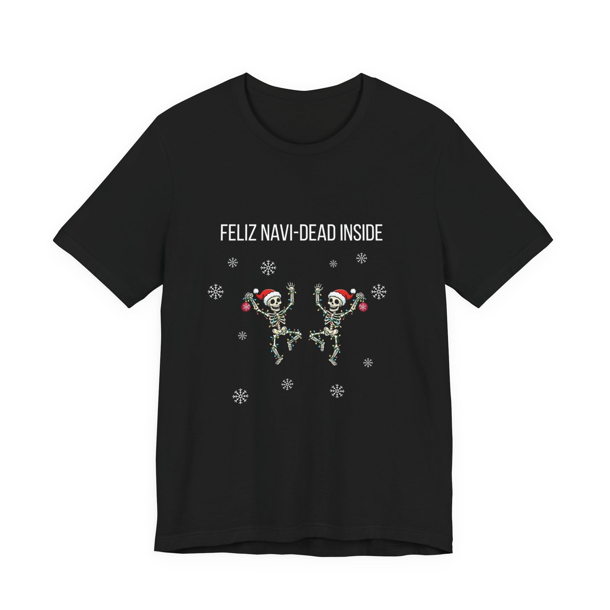 A festive and quirky T-shirt featuring a dancing Christmas skeleton wrapped in colorful Christmas lights with white snowflakes. The text 'feliz navi dead inside' adds a humorous touch. Perfect for those who enjoy unique and playful holiday-themed apparel. Ideal for Christmas celebrations and casual wear during the holiday season.